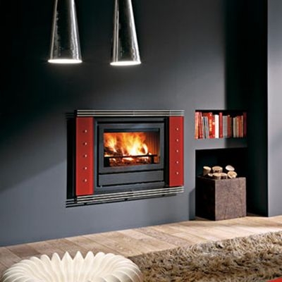 Каминная рамка из красного сериграфированного закаленного стекла с декоративными "болтами" из полированной нержавеющей стали.