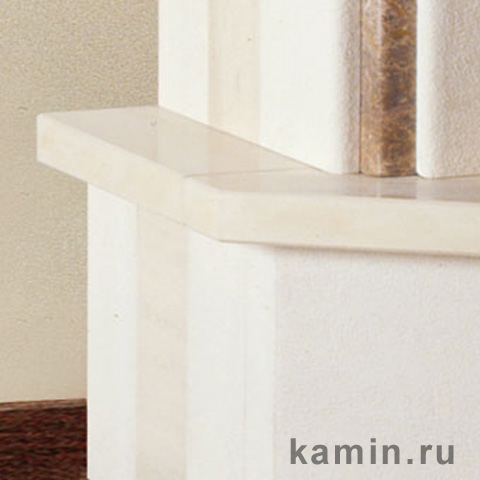 Пристенный камин в стиле модерн выполнена из белого камня. Основание этой модели выполнено из светло-бежевого мрамора, а балка - из светлого дерева.